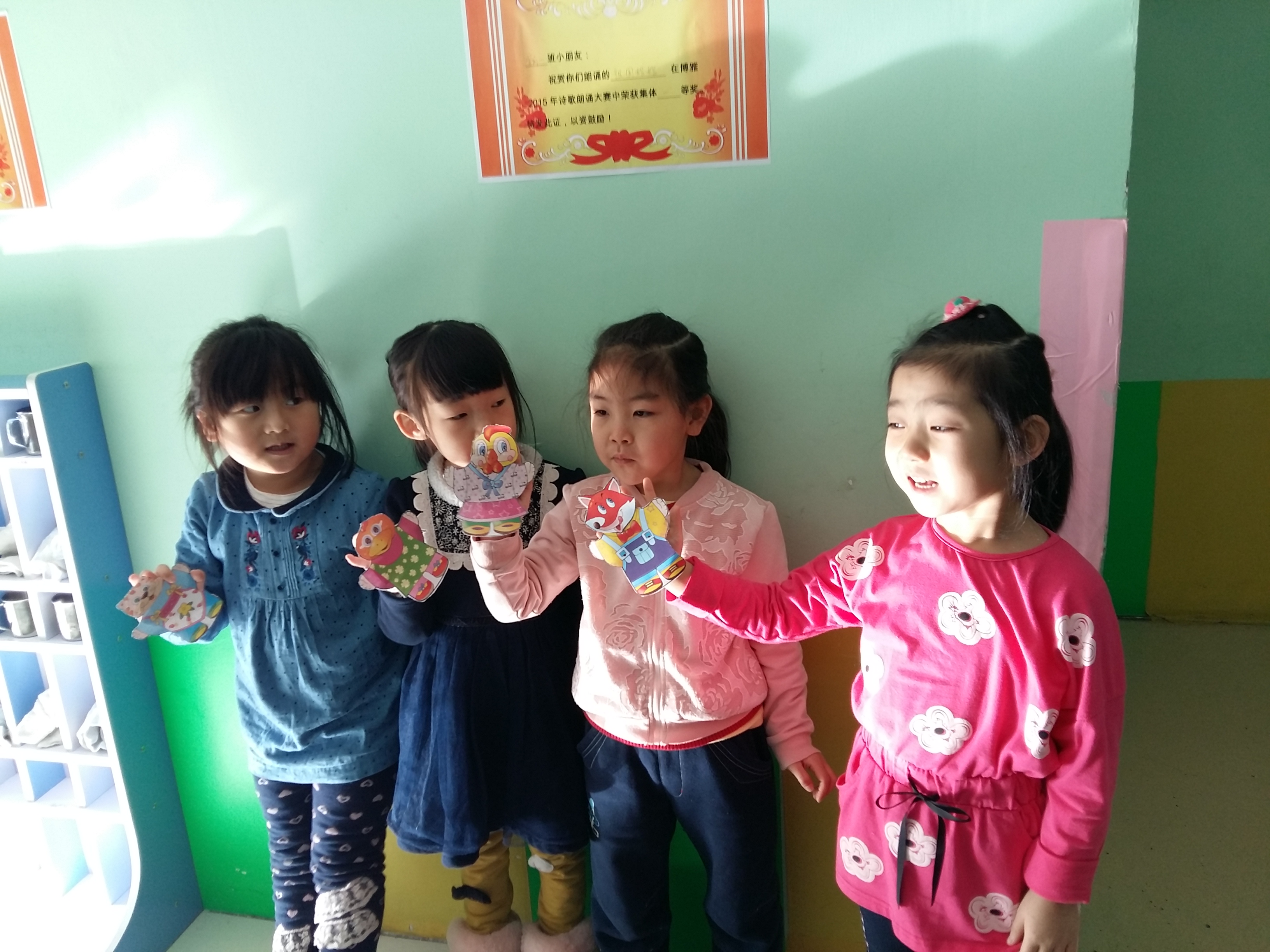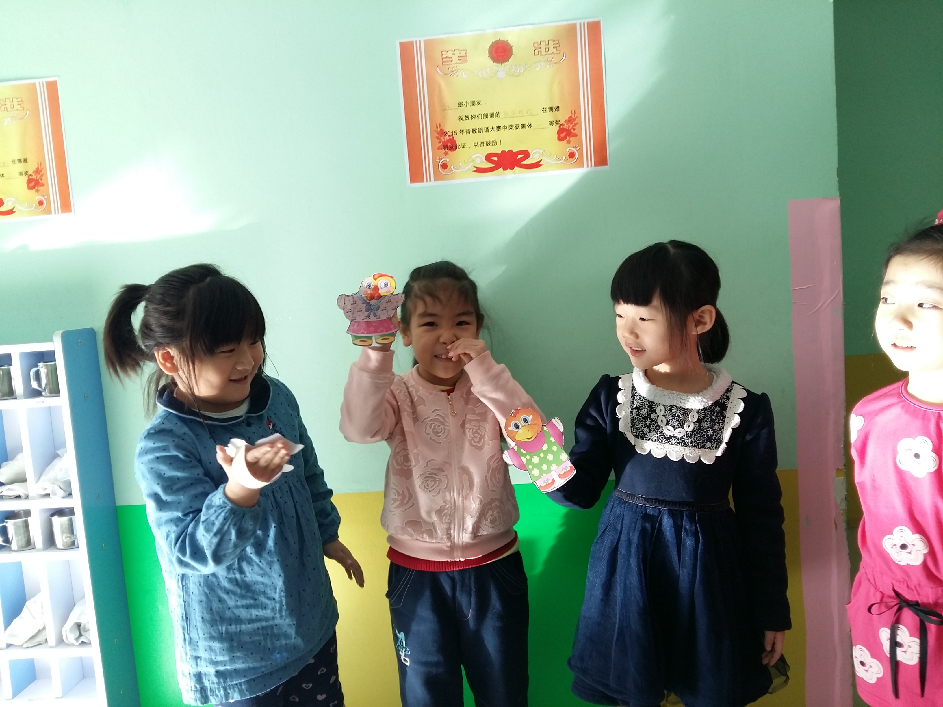 小朋友们用自己制作的手偶表演故事——金鸡冠的公鸡