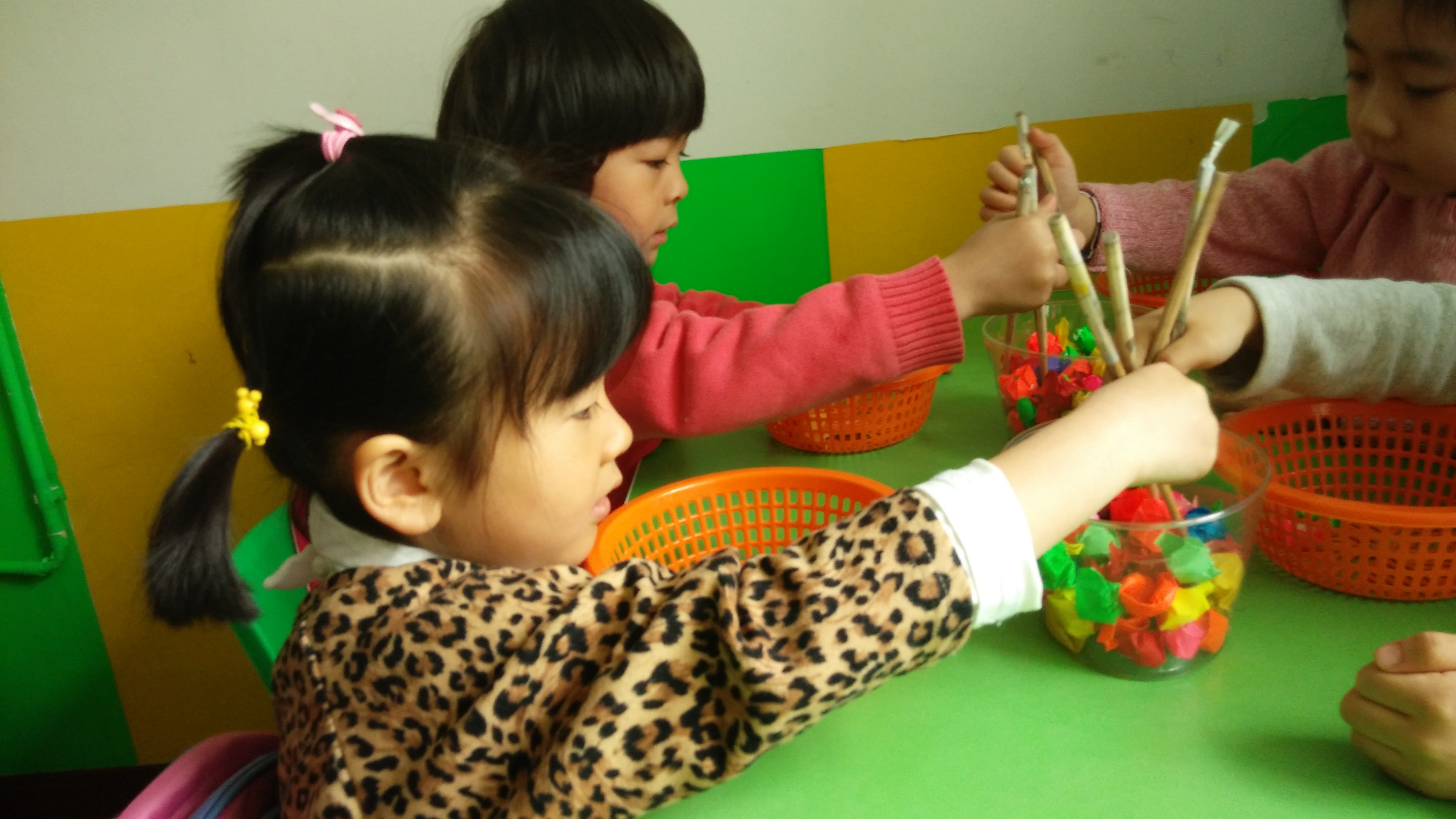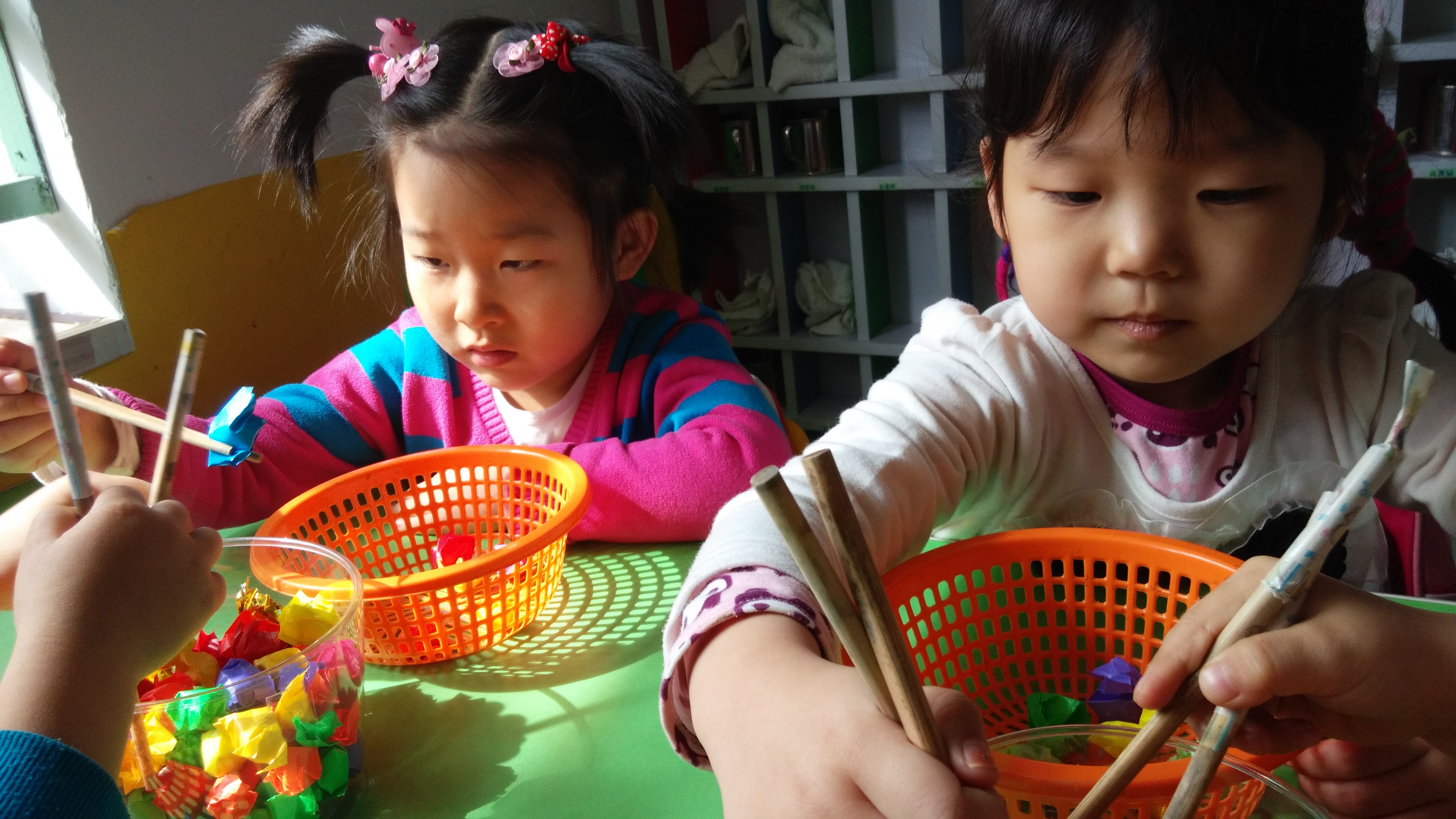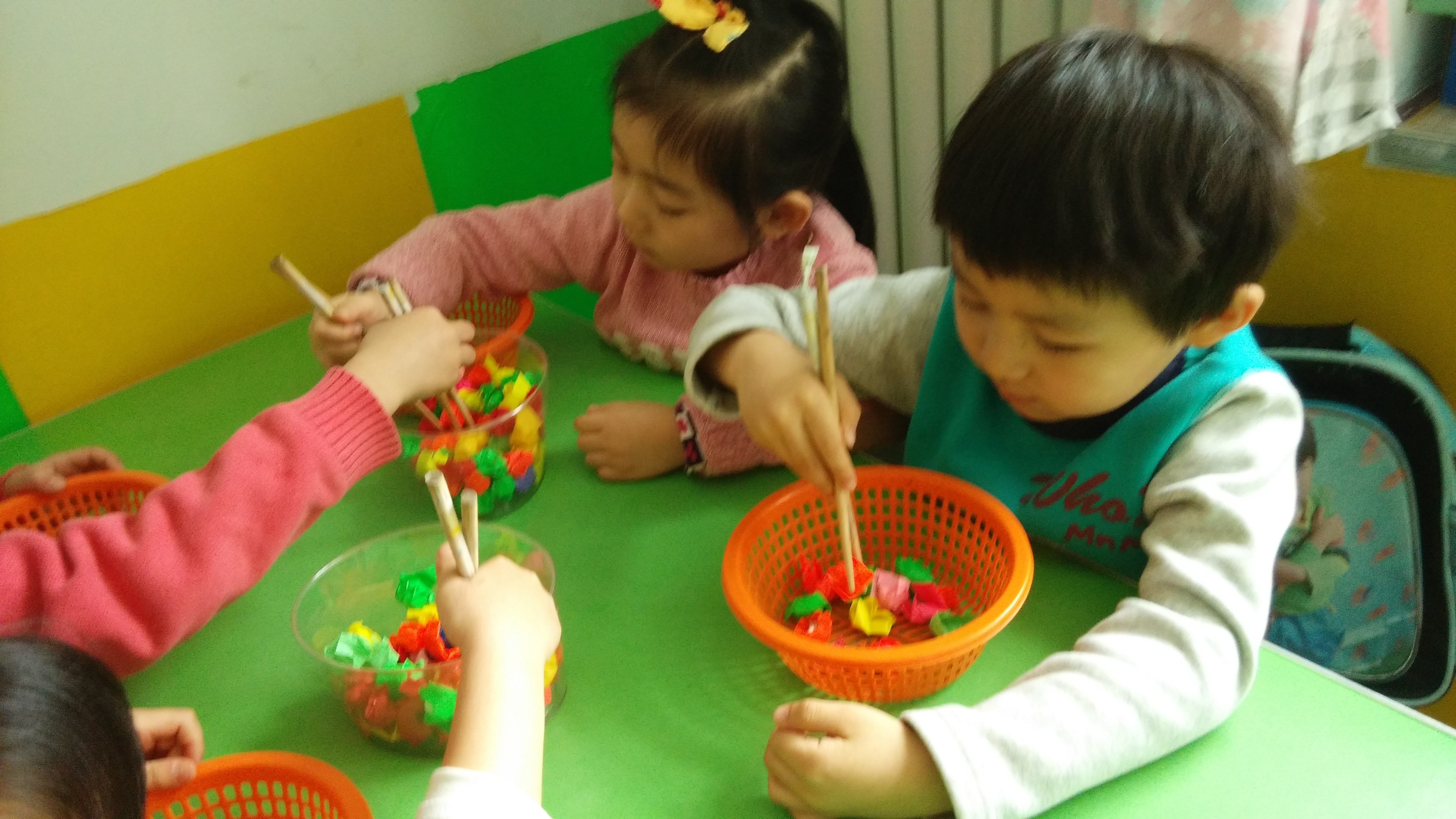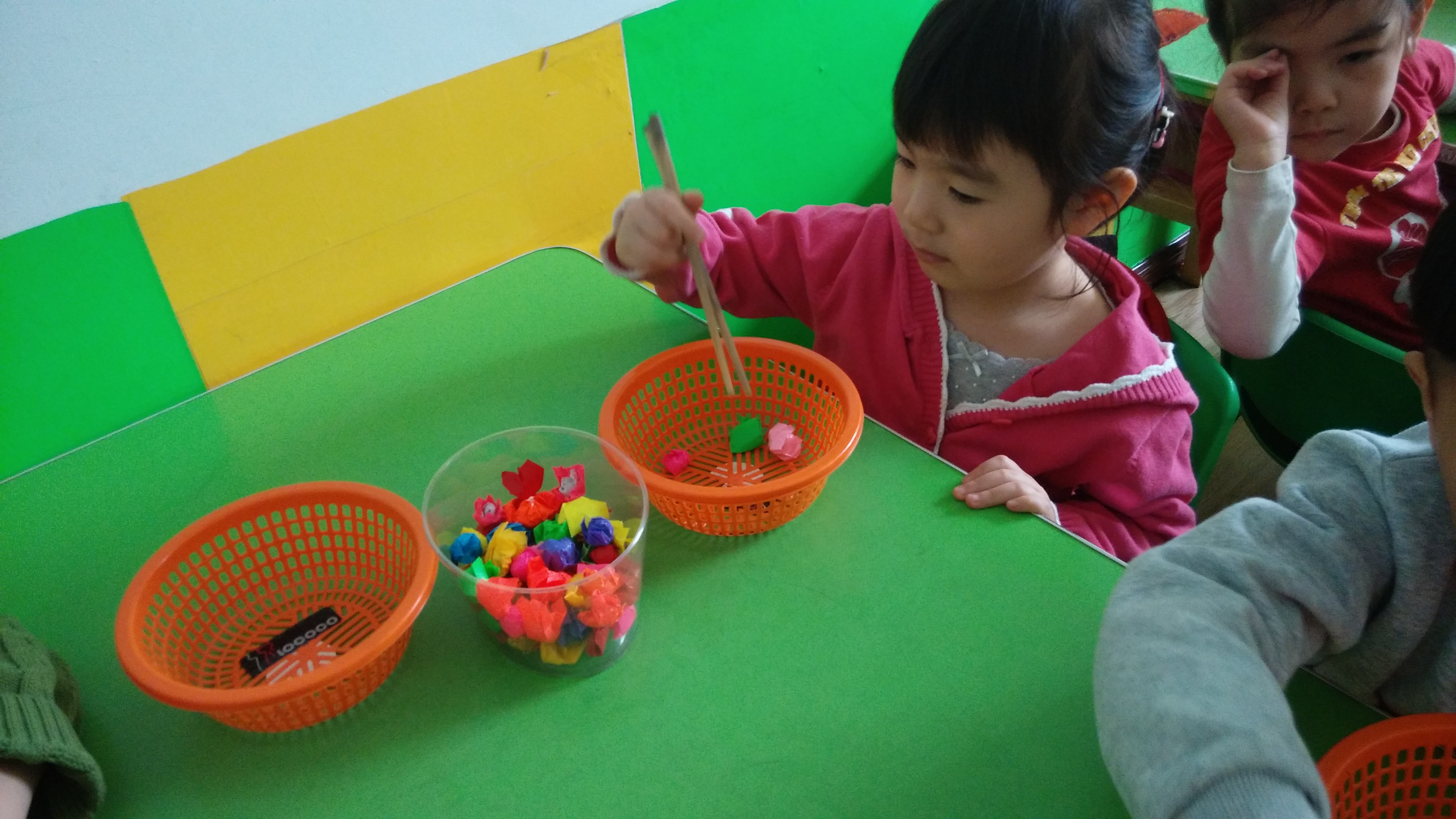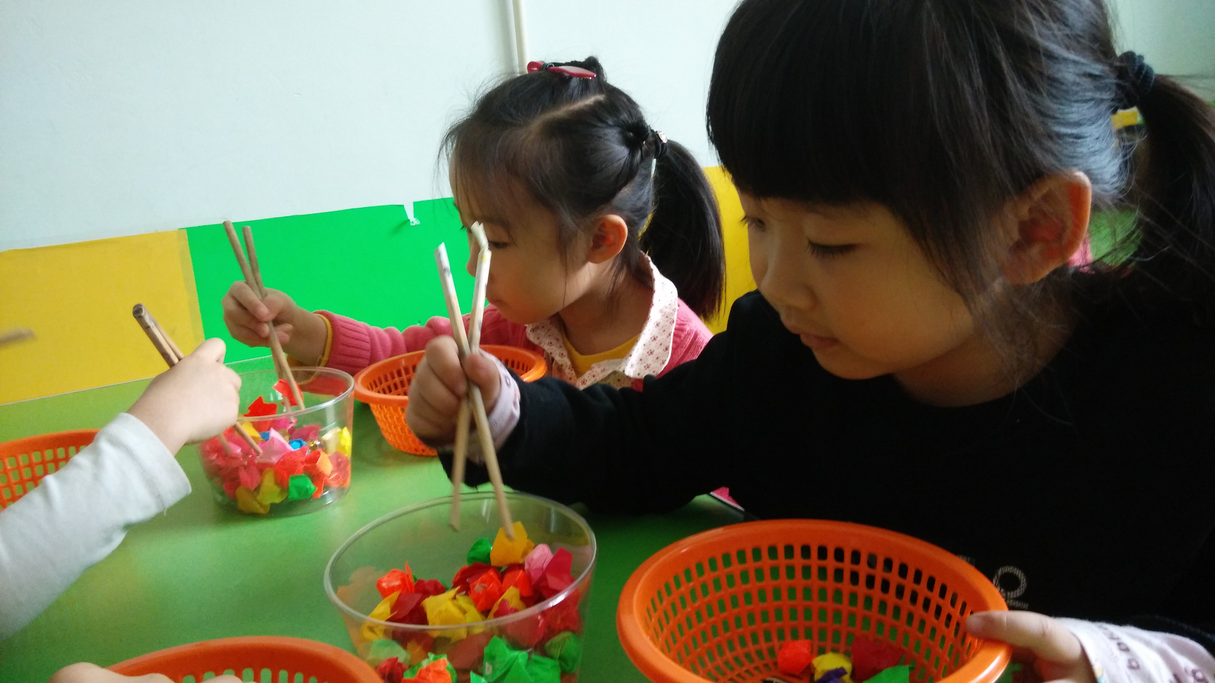 今天,中一班的小朋友们在室内游戏时间里,正在用筷子练习夹球呢!看他们夹得多专注呀!