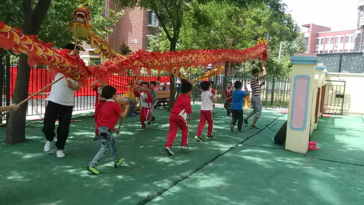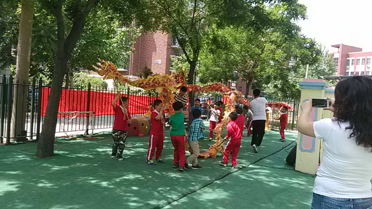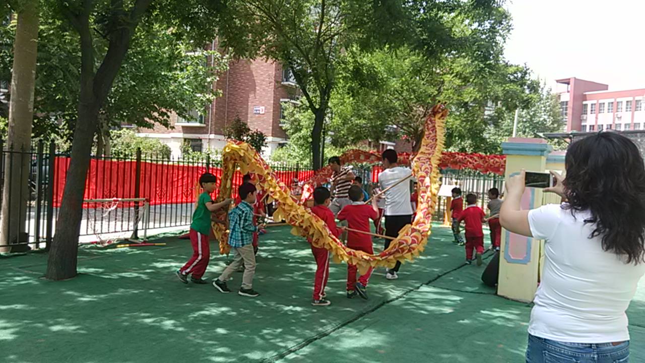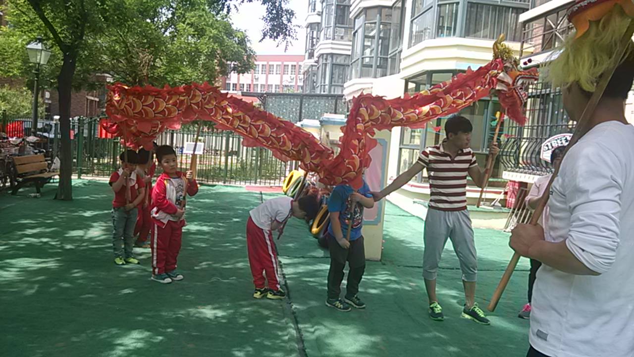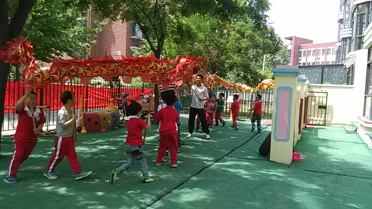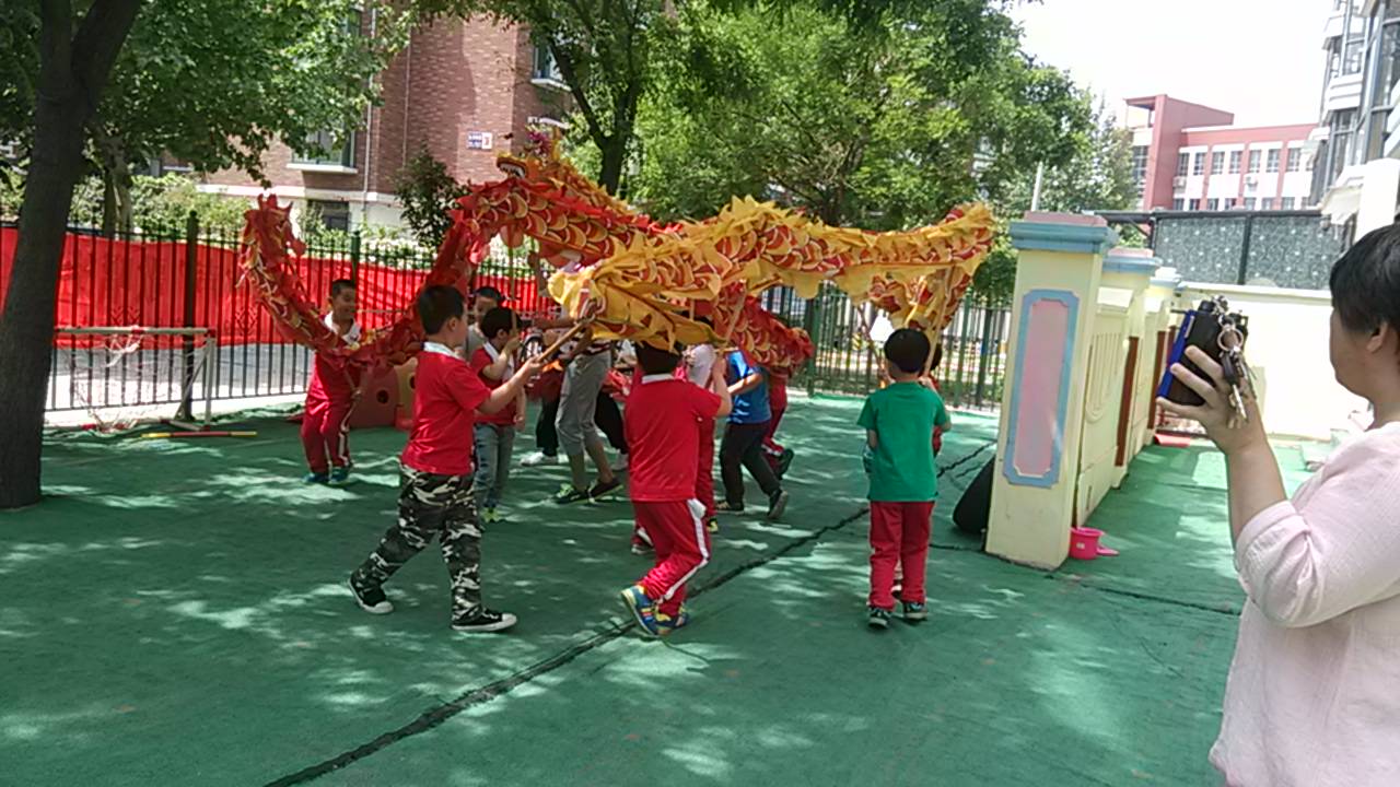 六一就要临近,小朋友们在两位教练的带领下,正在进行舞龙排练