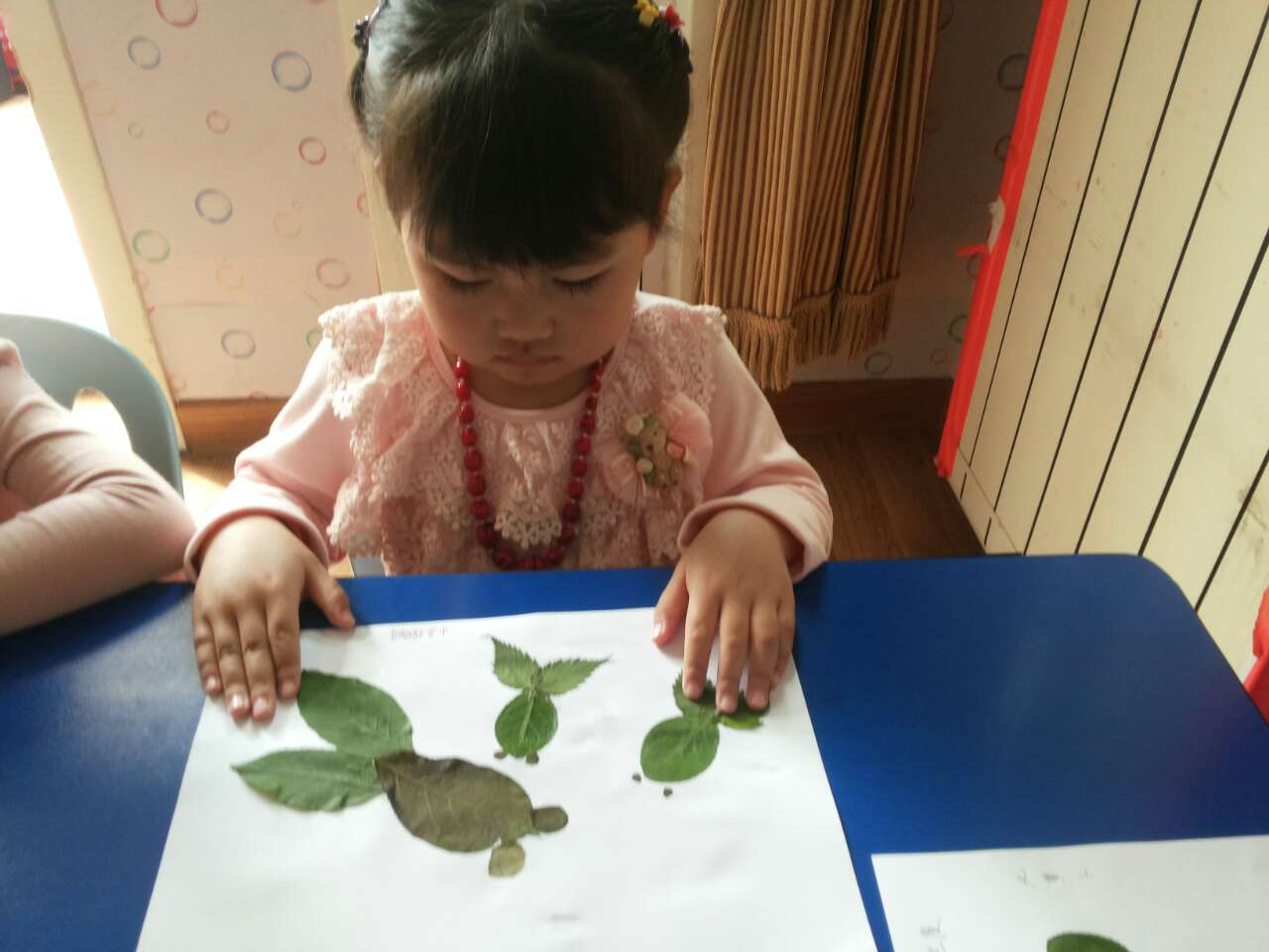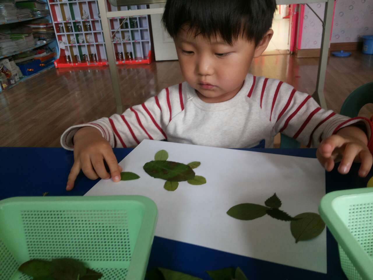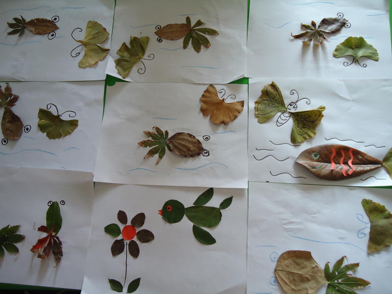 小朋友,这些漂亮的画都是用树叶粘贴的,你也去捡一些落叶,粘贴成一副美丽的树叶画,好吗?比一比谁做得最好!