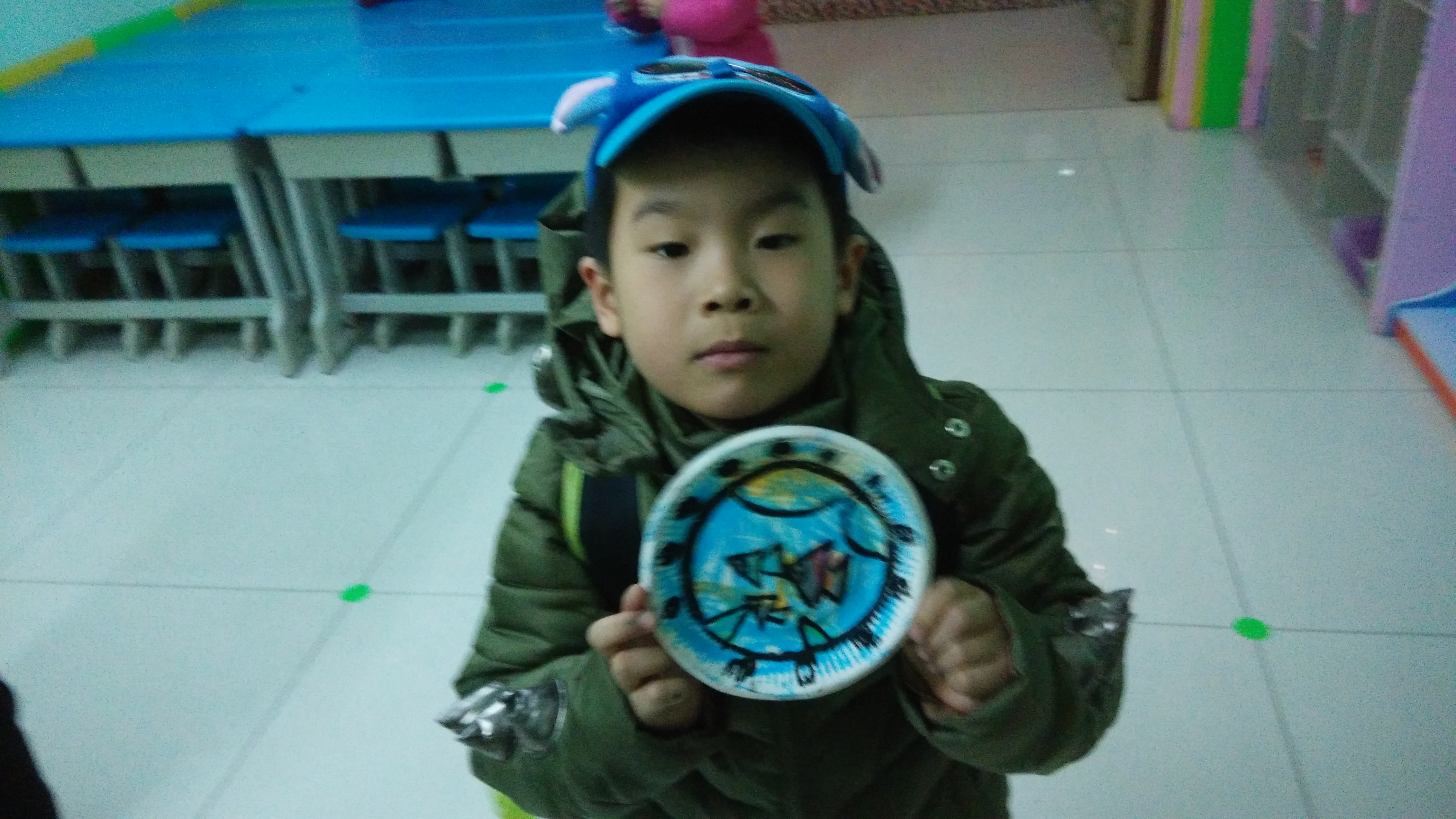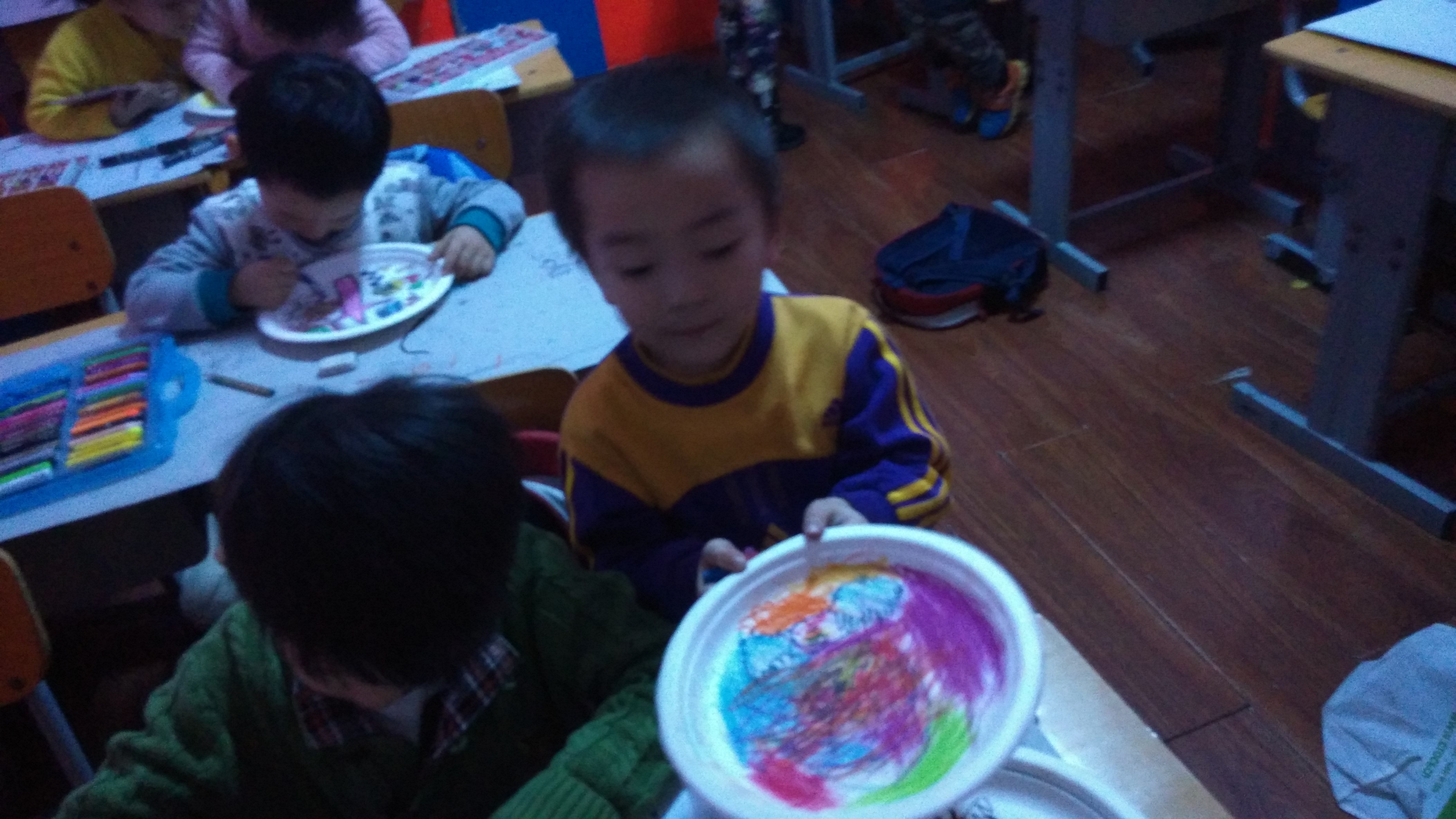 本学期的最后一节美术特色课上,孩子们正在用盘子作画。看他们画得多漂亮!