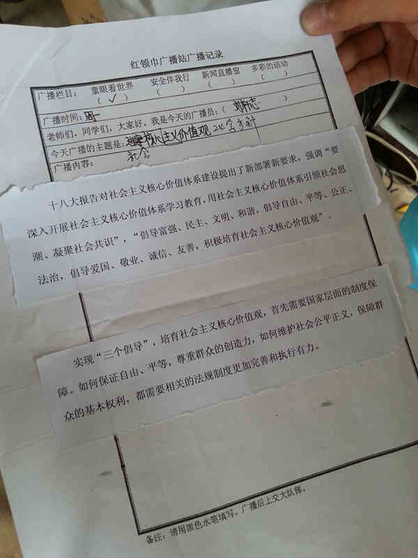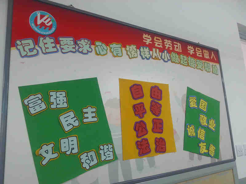 我校积极贯彻社会主义核心价值观,利用升旗仪式、红领巾广播站、班级文化宣传栏等阵地进行大力宣传与学习,努力践行24字方针和16字要求。